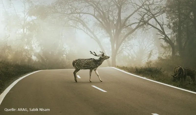 Stimmt. Mit Beginn der dunkleren Jahreszeit steigt jährlich die Zahl der Autounfälle durch Wildwechsel. Das liegt daran, dass die Tiere verstärkt in der Dämmerung unterwegs sind und diese fällt nun immer früher mit den Hauptverkehrszeiten zusammen. Durch die Zeitumstellung, die bald naht, liegt zudem die Aktivitätsphase gerade von Damwild in Zeiten des Berufsverkehrs. Dazu kommt verstärkter Nebel, der die Sicht behindert. Insbesondere an Wald- und Feldrändern sollten Autofahrer aufmerksam sein und die Geschwindigkeit reduzieren. Wenn ein Tier im Scheinwerferlicht auftaucht: abblenden, bremsen und hupen. Niemals ausweichen. Das Risiko, in den Gegenverkehr zu geraten oder den Wagen zu überschlagen, ist viel zu groß. Und die ARAG Experten warnen auch vor Nachzüglern, denn selten kommt ein Tier allein.