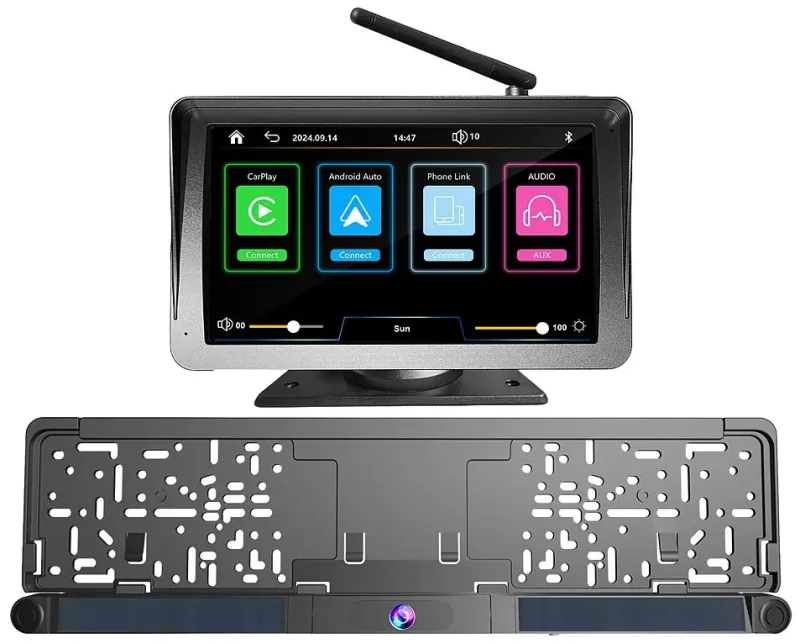 - Solar-Funk-Rückfahrkamera-Set PA-755 bestehend aus Kennzeichenhalter mit Solar-Funk-Rückfahrkamera und Abstandswarnern, Carplay-Monitor, Monitor-Halterung, USB-Ladekabel (USB-C auf USB-A), USB-Kfz-Stromkabel (USB-C auf 12 V (Zigarettenanzünder-Stecker)), AUX-Kabel (3,5 mm Klinke), Montagematerial und deutscher Anleitung