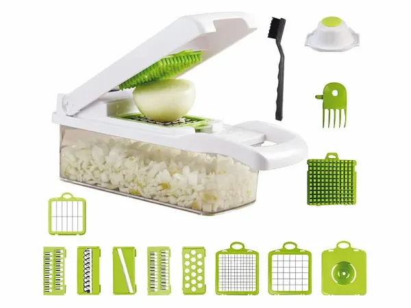 - 16in1-Gemüseschneider inklusive 3x Würfelschneider, 1x Eiertrenner, 1x Pressscheibe, 2x Reiben, 1x Mandoline, 1x Knoblauchreibe, 1x Wellenschneider, 1x Abflusssieb, 1x kleine Bürste, 1x lange Bürste, 1x Handschutz,1x Messerhalter, 1x Messeraufbewahrungsbox, 1x transparente Aufbewahrungsbox und deutscher Anleitung