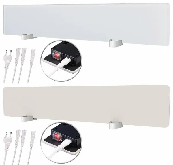 - Infrarot-Heizung inklusive Anschlusskabel, Verbindungskabel für weiteres Gerät, Standfüße, Montagematerial, Bohrschablone und deutscher Anleitung