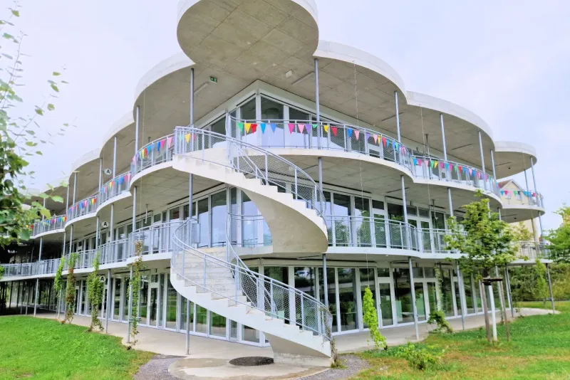 Reduce to the Maximum - dieses Prinzip wurde bei Planung und Umsetzung verfolgt. Das neue Schulhaus präsentiert sich offen, modern und transparent. "Das neue Schulhaus hat Mickey-Mouse-Ohren", so titelte eine lokale Zeitung in einer der ersten Berichte, die gewölbten Erschließungsebenen erinnern an genau das Bild. Frei geformt oder streng kubisch? In den Beschreibungen sind sich die Fachleute uneinig. Die schlanken Stahlstützen der ausschweifenden Laubengänge und die Stämme von bestehenden und neu gepflanzten Bäumen umspielen das Haus. Tagsüber gehören die Laubengänge und das viele Grün in der Umgebung den Schülern, sie umkreisen das große Schulhaus auf den geschwungenen Balkonen, Treppen und Rampen. Für die restliche Zeit dienen die Lauben als öffentliche Räume für die Anwohner.