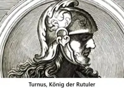 Turnus gilt als mythischer König der Rutuler und zentrale Gegenfigur zum trojanischen Helden Aineias >>. Er wird als Sohn des Daunus beschrieben und war ursprünglich als Bräutigam für Lavinia, die Tochter des latinischen Königs Latinus, vorgesehen. Doch ein göttliches Orakel bestimmte, dass Lavinia einem Fremden – Aeneas – zur Frau gegeben werden sollte. Diese Entscheidung löste einen Konflikt aus, der in der Überlieferung als entscheidender Krieg zwischen den einheimischen italischen Völkern und den trojanischen Neuankömmlingen geschildert wird.