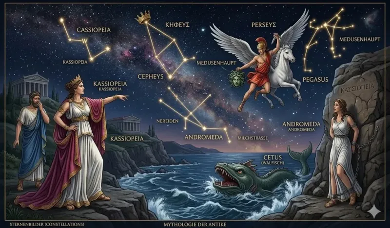 Kassiopeia, eines der markantesten Sternbilder des Nordhimmels, fasziniert seit Jahrtausenden sowohl Astronomen als auch Mythologen. Als das „Himmels-W“ ist sie für jeden Himmelsbeobachter ein unverwechselbarer Wegweiser. Doch hinter den leuchtenden Fixsternen verbirgt sich eine dramatische Geschichte von Hochmut, göttlichem Zorn und einer schicksalhaften Verbindung zu ihrer Tochter Andromeda.